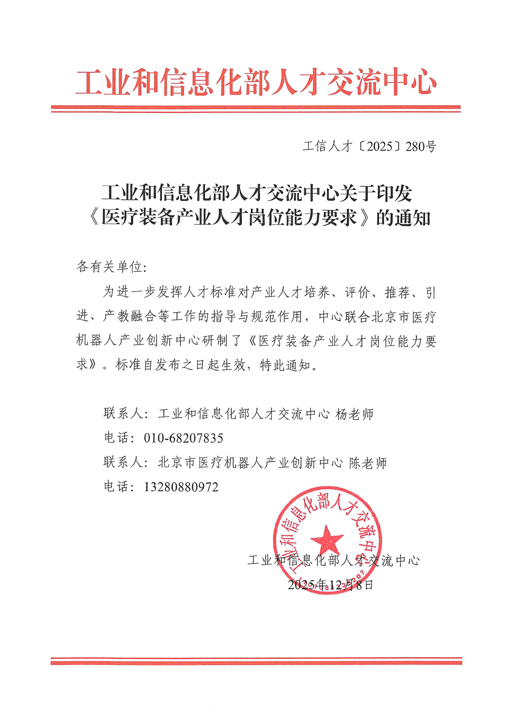 工业和信息化部人才交流中心关于印发《医疗装备产业人才岗位能力要求》的通知