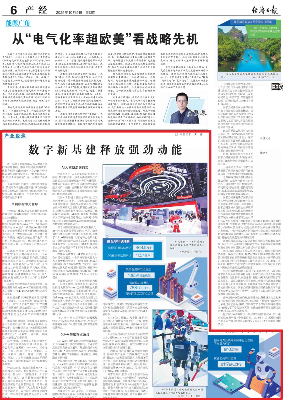 华为中国地区部副总裁黄雒蒙认为,AI将全面重塑每个行业的生产力。随着通信技术与信息技术融合创新加速,加快了个人AI服务普惠,为家庭和企业用户打造了全场景的融合AI服务,拓宽了运营商的业务边界。运营商也正加速把AI应用于全生产流程各环节和网络各领域,实现增收、提效、降本。在本届通信展上,AI应用处处可见。在中国电信展区,一台具身智能机器人与人类舞者共同演绎了一段英歌舞,机器人动作精准,与人类配合默契。“这背后,是中国电信强大的5G超低时延网络、云计算与边缘计算能力,保障海量感知数据的传输与AI的实时决策控制。”工作人员告诉记者。中国铁塔展示了空间治理行业大模型——经纬大模型,该模型包含180亿参数视觉大模型和1980亿参数多模态大模型,具备目标检测、零样本开放检测、图文问答及推理等能力。目前,经纬大模型已完成DeepSeek能力接入、轻量化压缩、工程化部署与中试平台验证,并加快推进细分行业大模型迭代开发及商业化应用。此外,基于类人智能认知架构打造的通用铁塔智能体,在单个推理决策任务上耗时仅需2.6秒。“2024年中国人工智能产业规模超9000亿元,未来要在技术、应用、生态3个维度实现共振。”中国信息通信研究院副院长魏亮说。5G-A加速商业落地5G-A(5G网络的演进和增强版本)是5G向6G演进升级的关键阶段。