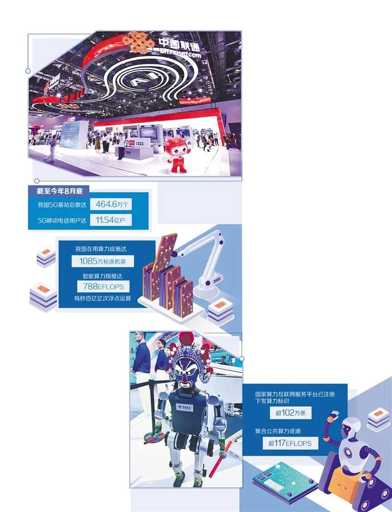 在此前举行的“高质量完成‘十四五’规划”系列主题新闻发布会上,工业和信息化部副部长张云明介绍,我国已建成全球技术领先、规模最大的信息通信网络。网络能力迈入“双千兆”,全国三分之二的地级市达到千兆城市标准,完成超过24万个重点场所移动网络的深度覆盖,网络覆盖通达“县、乡、村”,架起农村地区共享数字红利“信息桥”“致富桥”。各类新型信息基础设施协调发展。我国在用算力设施达1085万标准机架,智能算力规模达788EFLOPS(每秒百亿亿次浮点运算)。信息通信技术深度赋能实体经济转型。全国“5G+工业互联网”建设项目超2万个,一批“无人矿山”“黑灯工厂”“智慧港口”等新模式、新业态逐步壮大。消费领域,智能终端、电商直播、沉浸式购物、数字文旅等新型信息消费产品和模式蓬勃发展。本届通信展期间,国家算力互联网服务平台迎来试运行满一年的关键节点,平台发布31省份标识系统、52条数据快递线路等多项创新成果,标志着我国算力互联网建设迈入“一池共享、一网互联、一图洞察、一触即达”的新阶段。截至目前,国家算力互联网服务平台已注册下发算力标识超102万条、聚合公共算力资源超117EFLOPS。