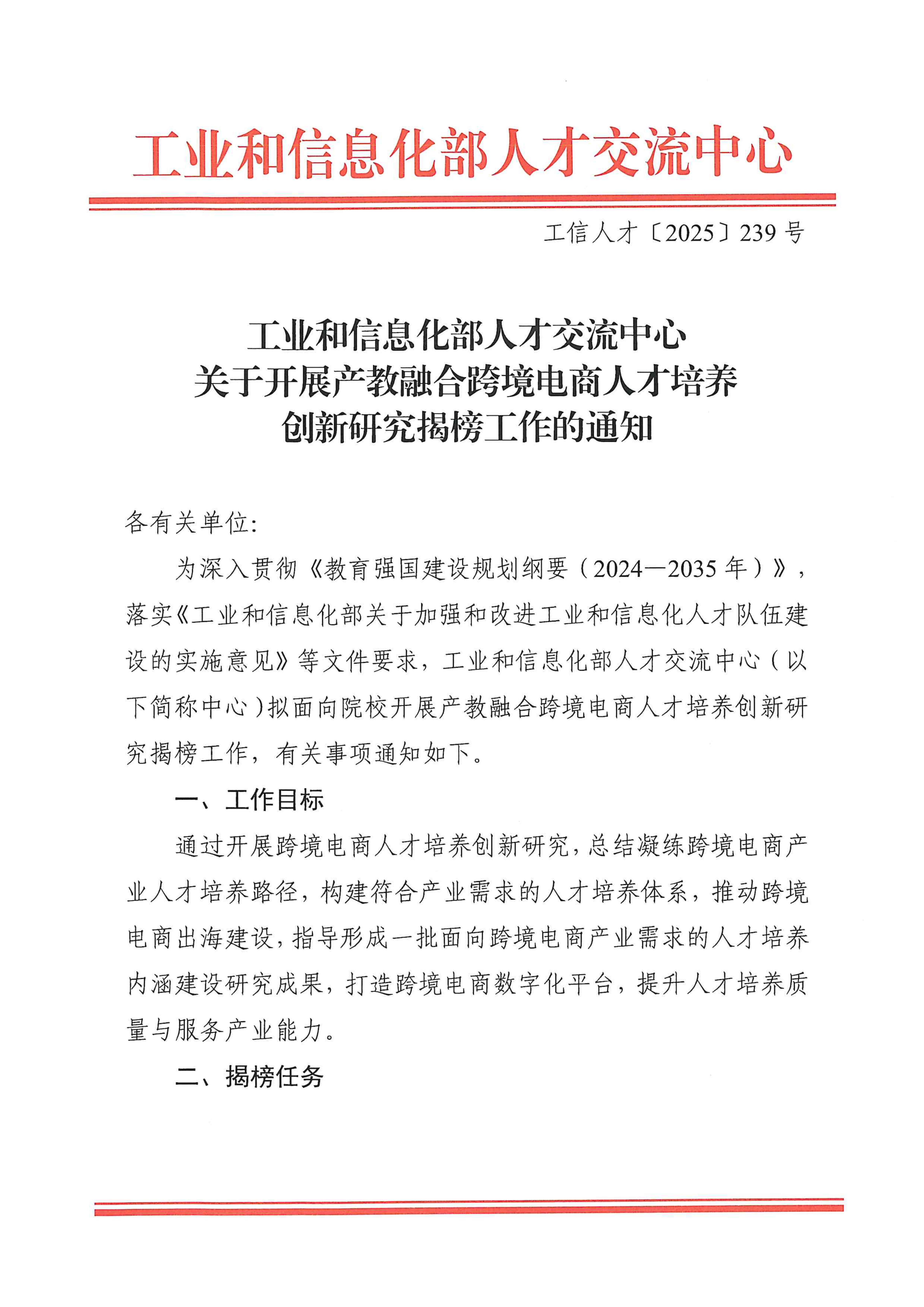 工业和信息化部人才交流中心关于开展产教融合跨境电商人才培养创新研究揭榜工作的通知