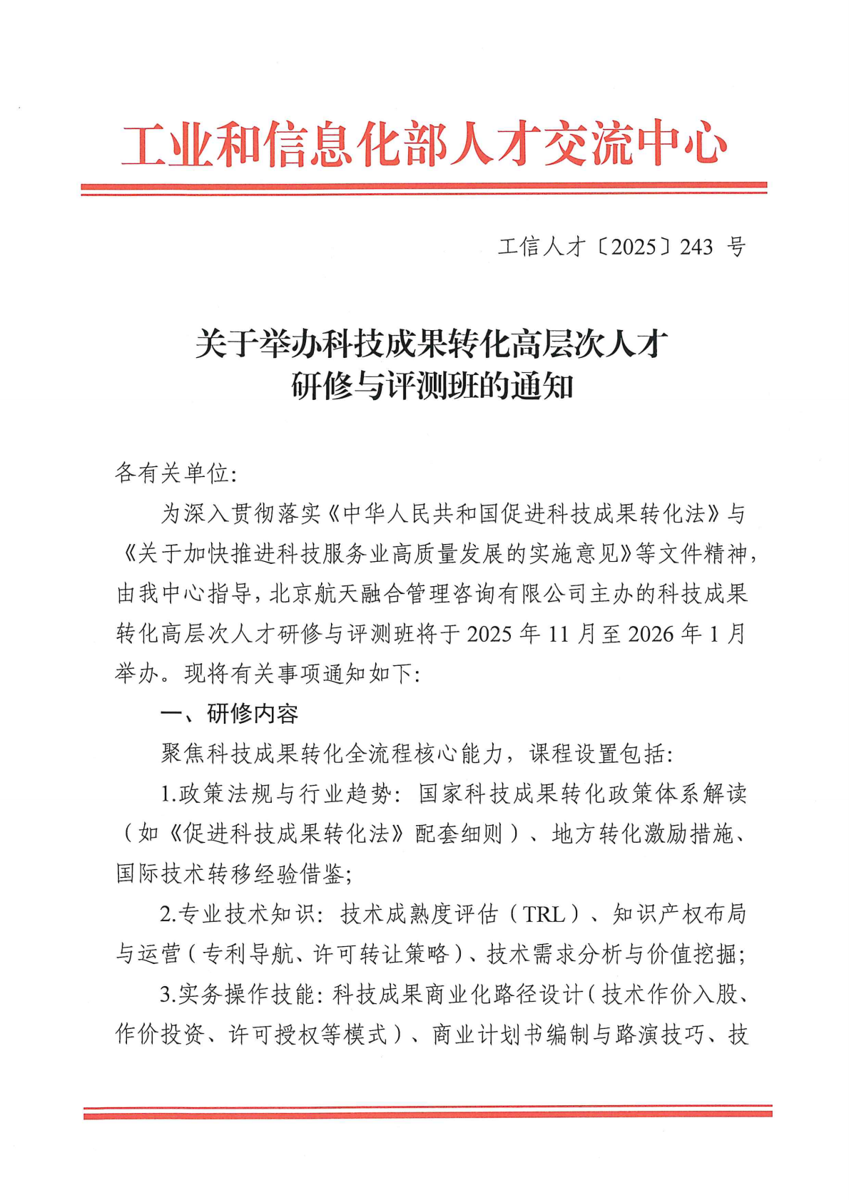 关于举办科技成果转化高层次人才研修与评测班的通知