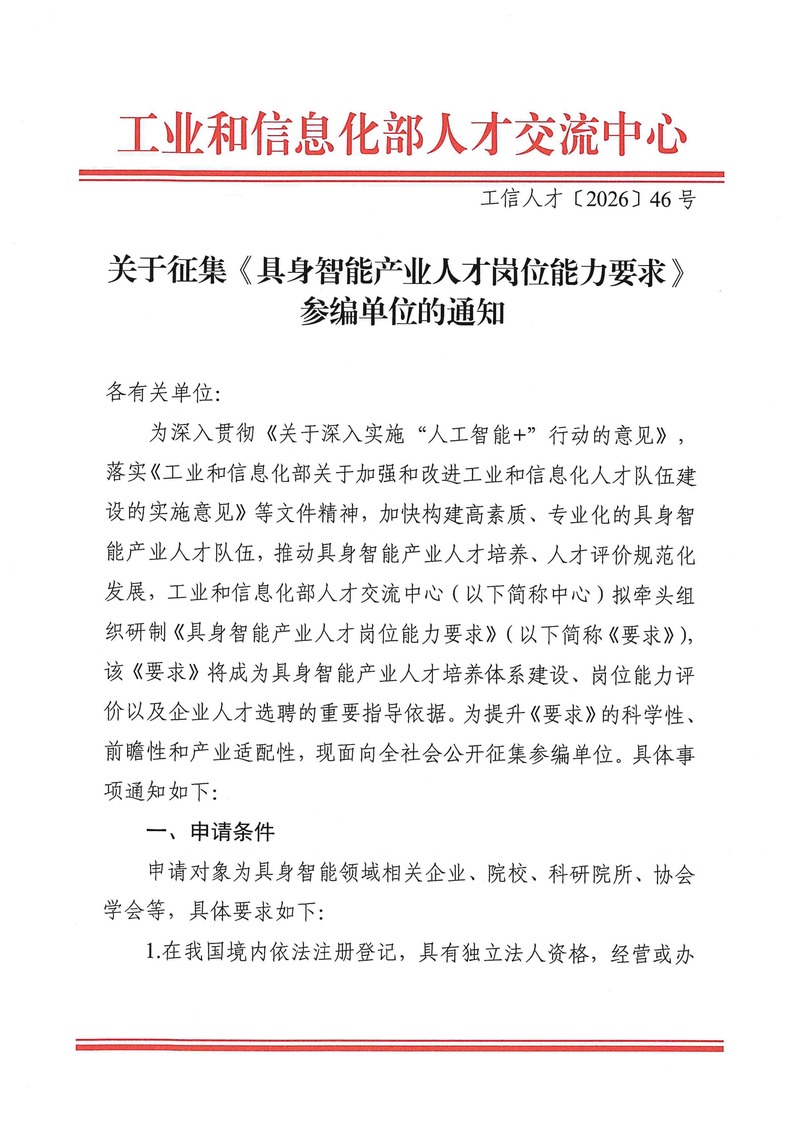 关于征集《具身智能产业人才岗位能力要求》参编单位的通知